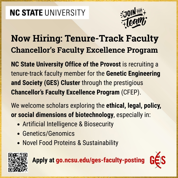 NC State University has launched a search for a new faculty member to join the Chancellor’s Faculty Excellence Program (CFEP) with the Genetic Engineering and Society (GES) Cluster. The Office of the Provost is recruiting for this tenure-track position, which represents a university-level investment in interdisciplinary scholarship at the intersection of genetic, genomic, and emerging biotechnologies and the societal contexts in which they develop.