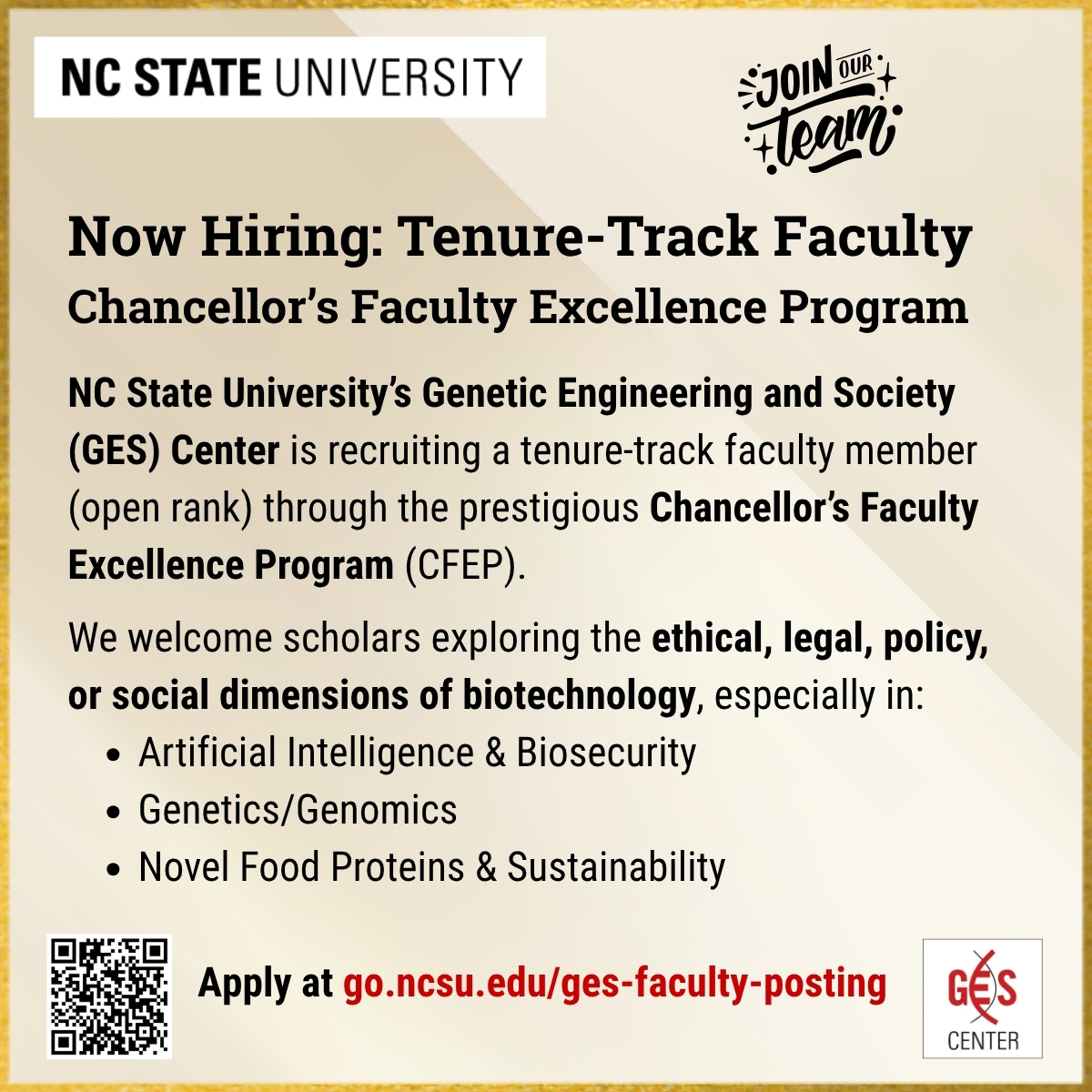 The Genetic Engineering and Society (GES) Center, part of the Chancellor’s Faculty Excellence Program (CFEP) at NC State University, is recruiting a tenure-track faculty member to join one of the nation’s premier interdisciplinary hubs examining the societal dimensions of biotechnology.